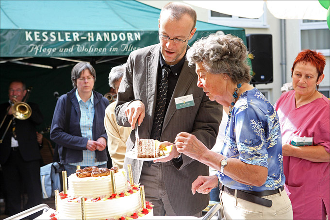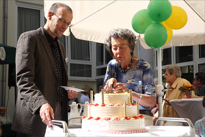 Heimleiter Johannes Schoner schneidet die große Geburtstagstorte an. Foto: Thomas Brenner.
