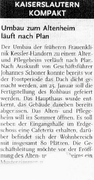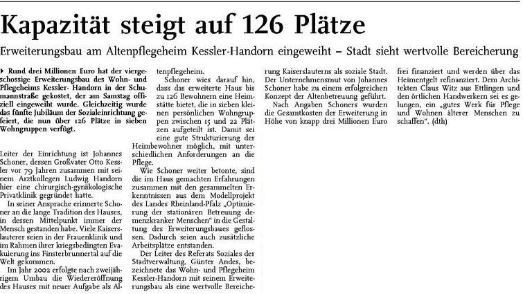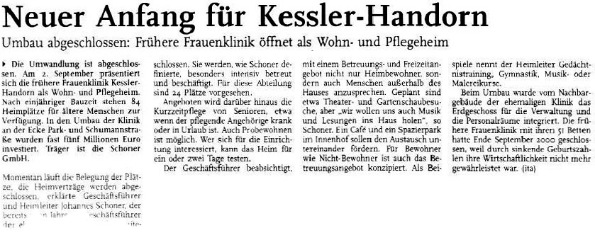 "Der Mensch bleibt für uns im Mittelpunkt" berichtete die Rheinpfalz. "In ehemalige Frauenklinik ziehen ältere Menschen ein - so die Headline der Rheinpfalz einige Wochen später. "Neuer Anfang für Kessler-Handorn", unter diesem Titel berichtete die Rheinpfalz am 16. August 2002. Hier ein Faksimile des Artikels. "Umbau zum Altenheim läuft nach Plan" berichtete die Rheinpfalz am 20. Januar 2002. Hier ein Ausschnitt des Beitrags.