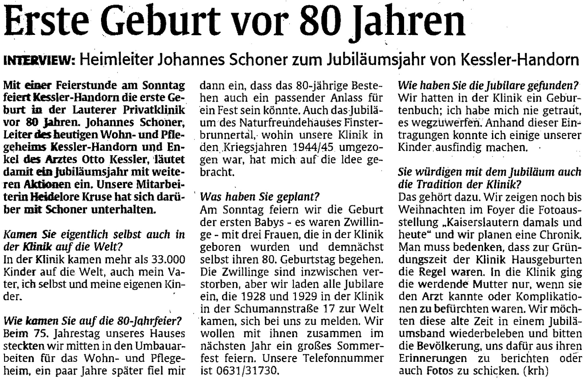 2008 fragte die Rheinpfalz unter dem Titel "Erste Geburt vor 80 Jahren" den Heimleiter Johannes Schoner zum Jubiläumsjahr. Zum Artikel.