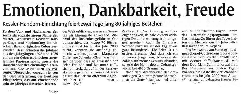 "Emotionen, Dankbarkeit, Freude - Kessler-Handorn-Einrichtung feiert zwei Tage lang 80-jähriges Bestehen". Hier ein Ausriss des Beitrags der Rheinpfalz vom 31. August 2009.
